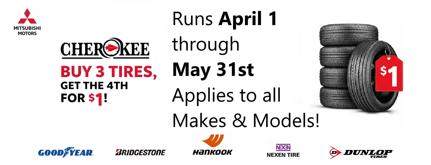 The provided tire link is managed by Mitsubishi and will only display offers for Mitsubishi vehicles. The dealership-exclusive promotion—Buy 3 tires, get the 4th for $1—runs from April 1 through May 31st, 2026 and applies to all makes and models. Eligible tire brands include Bridgestone, Dunlop, Goodyear, Hankook, Kumho, Nexen, Toyo, and Yokohama. This promotion is not reflected on the Mitsubishi-controlled link.